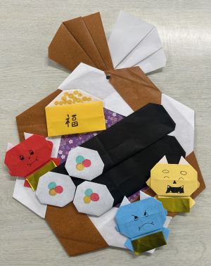 2月3日の節分に向けて手先が器用な職員が折り紙でリースを作りました!